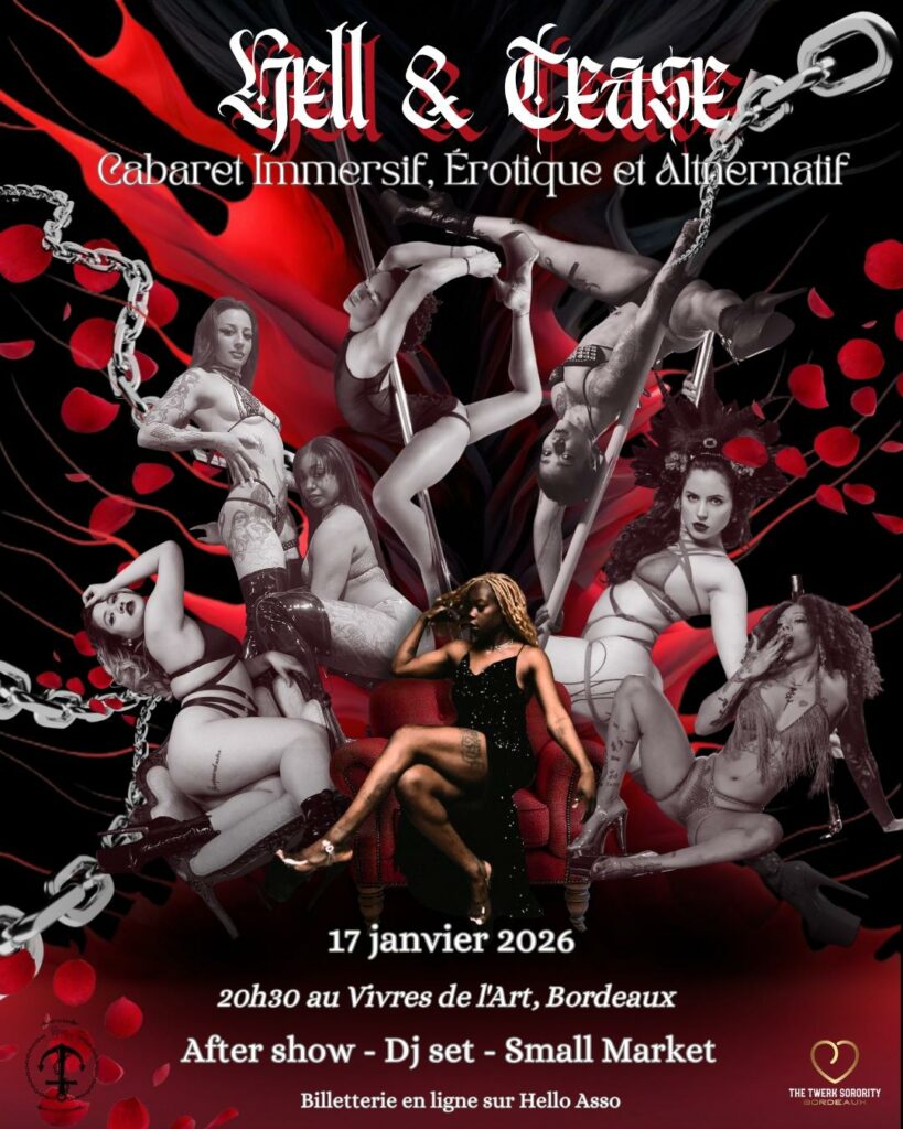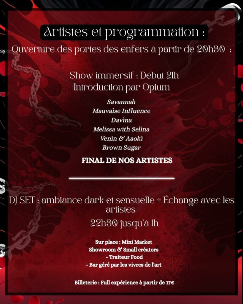 Opium vous donne rendez-vous aux portes des enfers le temps d'une soirée.Le Samedi 17 Janvier 2026, à partir de 20h30, Hell & Tease transforme les Vivres de l'Art en un Cabaret immersif.Plongez dans un show polydisciplinaire, alternatif et érotique.Prolongez l'expérience lors de l'after show dès 22h15 avec la dj Lilith : ambiance dark techno sensuelle et latine core jusqu'à 01:00.Programmation:Soirée en 2 parties :