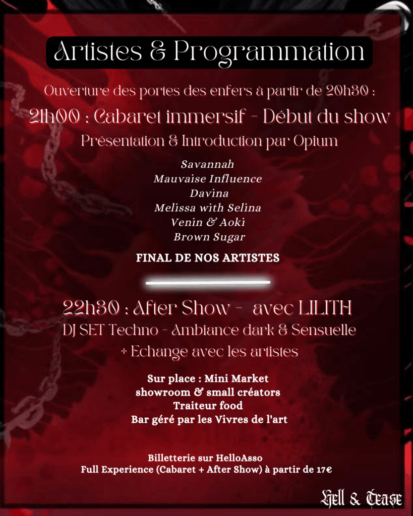 Opium vous donne rendez-vous aux portes des enfers le temps d'une soirée.Le Samedi 17 Janvier 2026, à partir de 20h30, Hell & Tease transforme les Vivres de l'Art en un Cabaret immersif.Plongez dans un show polydisciplinaire, alternatif et érotique.Prolongez l'expérience lors de l'after show dès 22h15 avec la dj Lilith : ambiance dark techno sensuelle et latine core jusqu'à 01:00.Programmation:Soirée en 2 parties :
