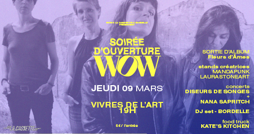 Le duo Diseurs de songes, qui présentera son album « Fleurs d’Âmes », laissera ensuite place au groupe de rockeuses Nana Sapritch, pour finir en beauté par un DJ Set du collectif Bordelle. De quoi mettre le feu aux Vivres de l’Art et lancer cette deuxième édition en beauté !